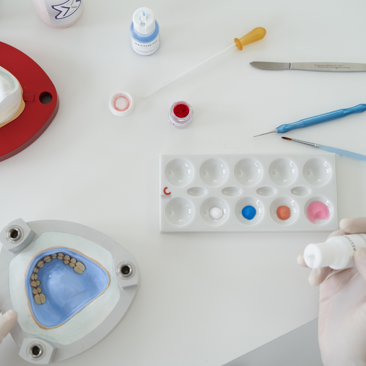3 verschiedene Farb-Nuancen und das Basismaterial Farbe 34 der Aesthetic Red (Heisspolymerisat) Kunststoffe ermöglichen auf einfache und schnelle Weise, eine individuelle Einfärbung der Gingiva. Das einfallende Licht wird durch die semiopake Einfärbung gebrochen und reflektiert. Dies lässt das Rosa des künstlichen Zahnfleisches besonders natürlich erscheinen.