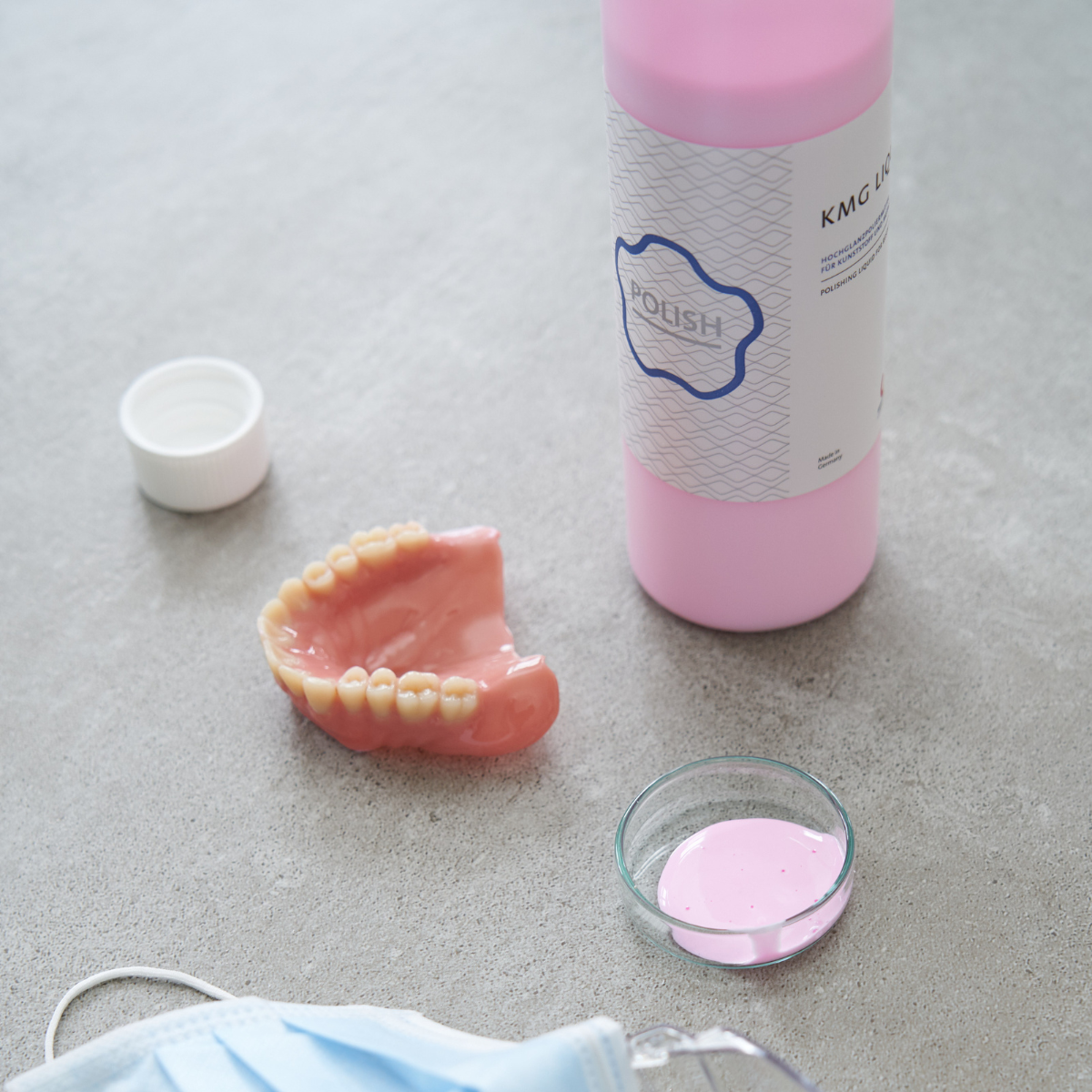 Das flüssige KMG Liquid ist ein Universal- Hochglanzpoliermittel für Prothesenkunststoffe und Metalle.