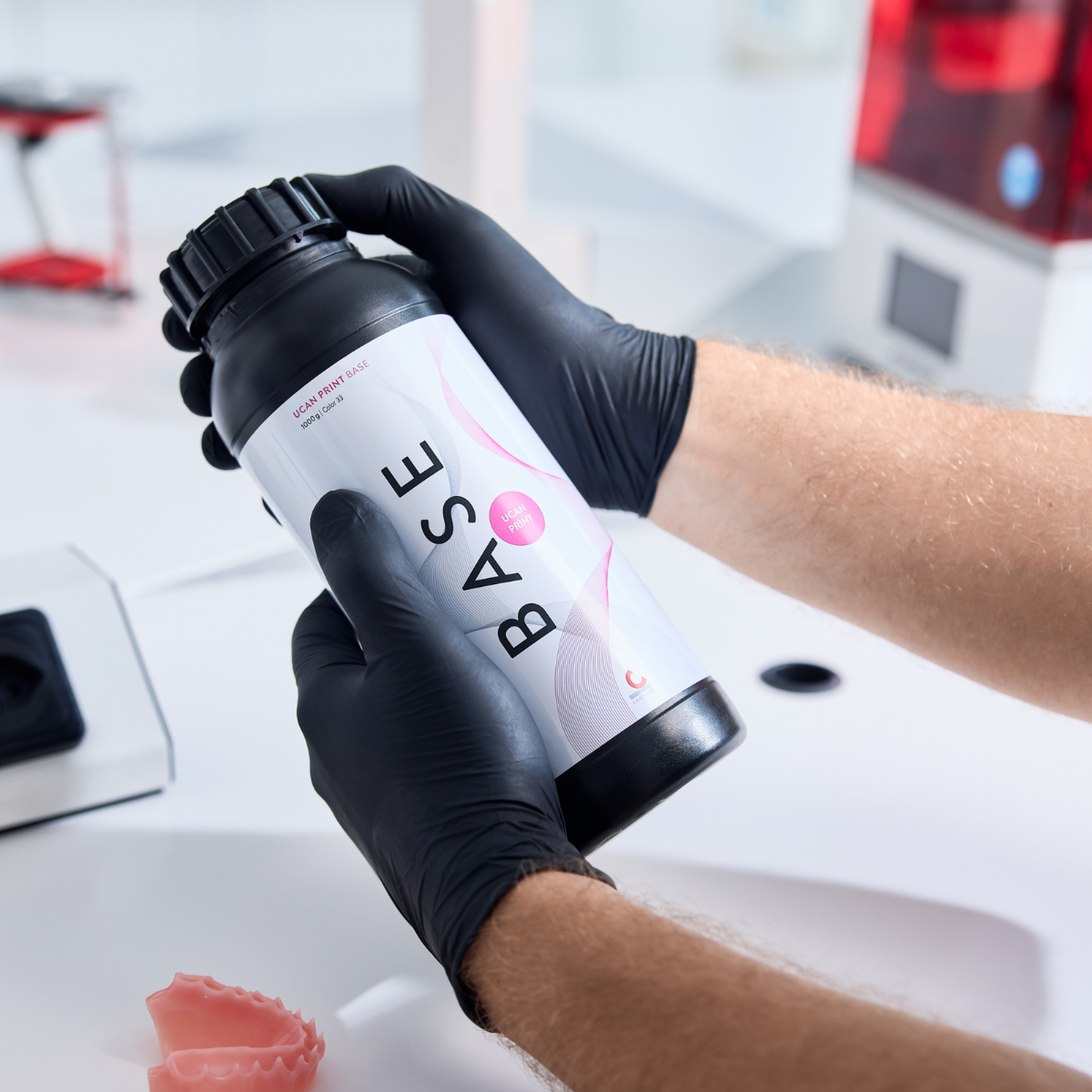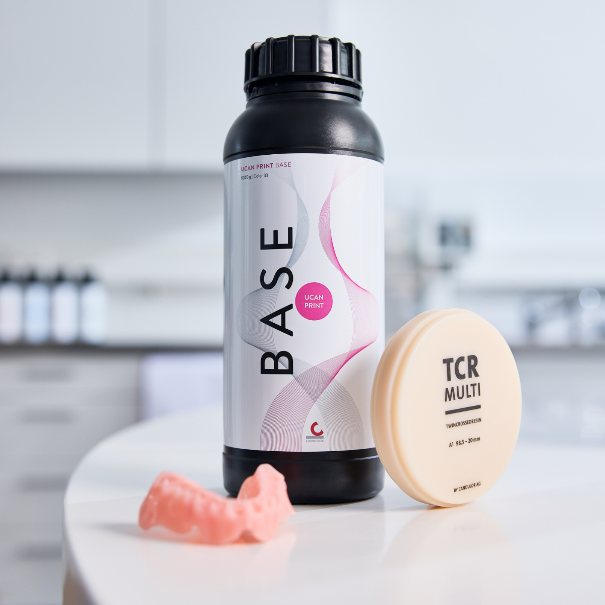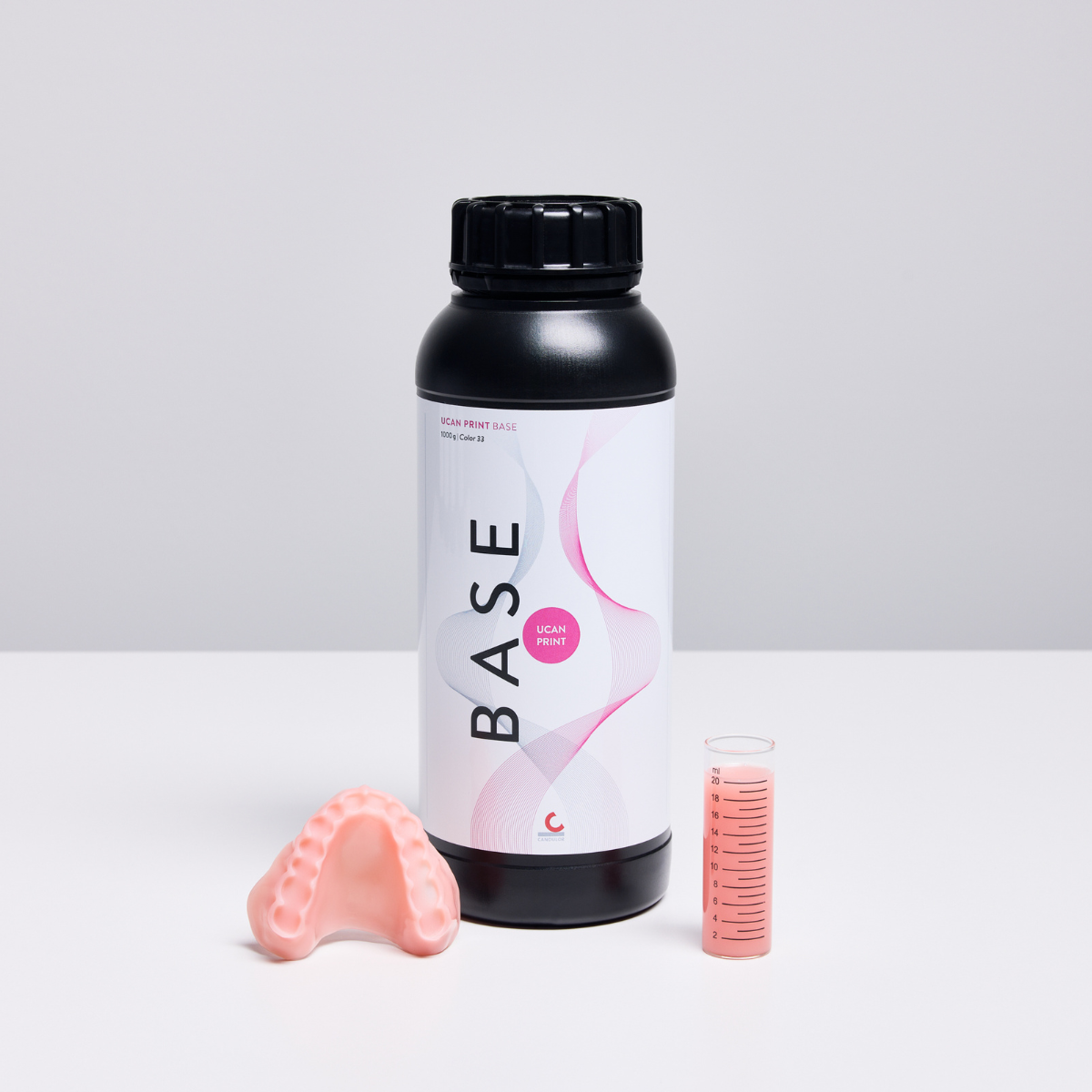 UCAN Print Base wurde als 3D-Druckharz für die generative Herstellung von Prothesenbasen entwickelt. Es garantiert im Vergleich zu traditionell verwendeten PMMA-basierten Materialien einen geringen Schrumpf (ca. < 1 %) und sorgt damit für eine hohe Passgenauigkeit. UCAN Print Base erfüllt alle wichtigen dentalen Anforderungen und zeichnet sich durch high impact Eigenschaften sowie eine niedrige Viskosität aus.