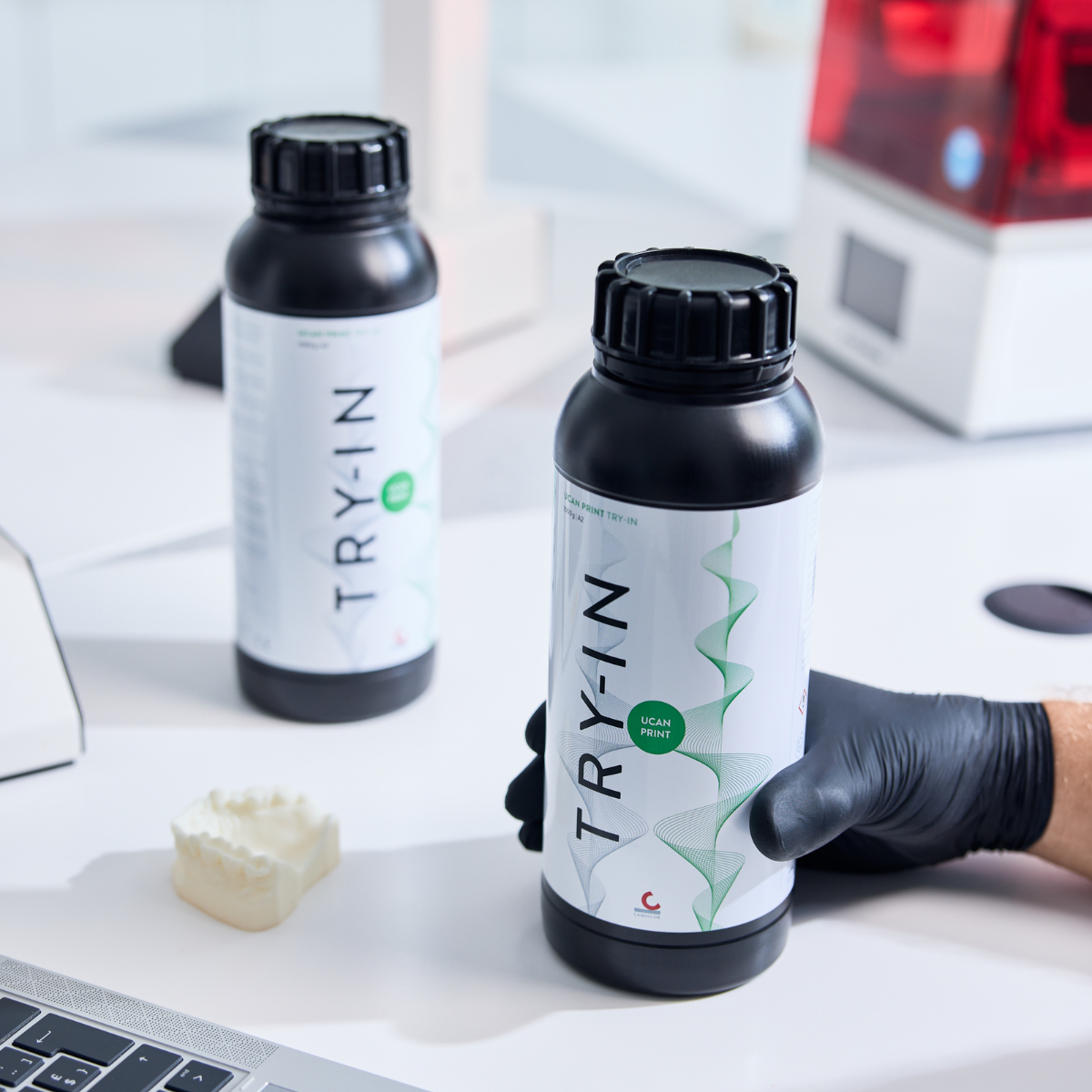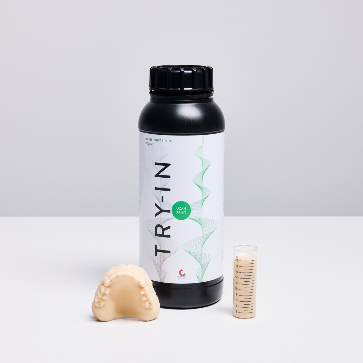 Als biokompatibles Medizinprodukt der Klasse 1 eignet sich UCAN Print Try-in als Basismaterial zur Funktionseinprobe von digital gefertigten Prothesen. Daraus hergestellte dentale Formteile wie Prothesenbasen, die mit individueller Zahnaufstellung generativ gefertigt werden, können so in Bezug auf Bissregistrierung und Okklusion überprüft werden. Verfügbar ist das Material in der Zahnfarbe A2.