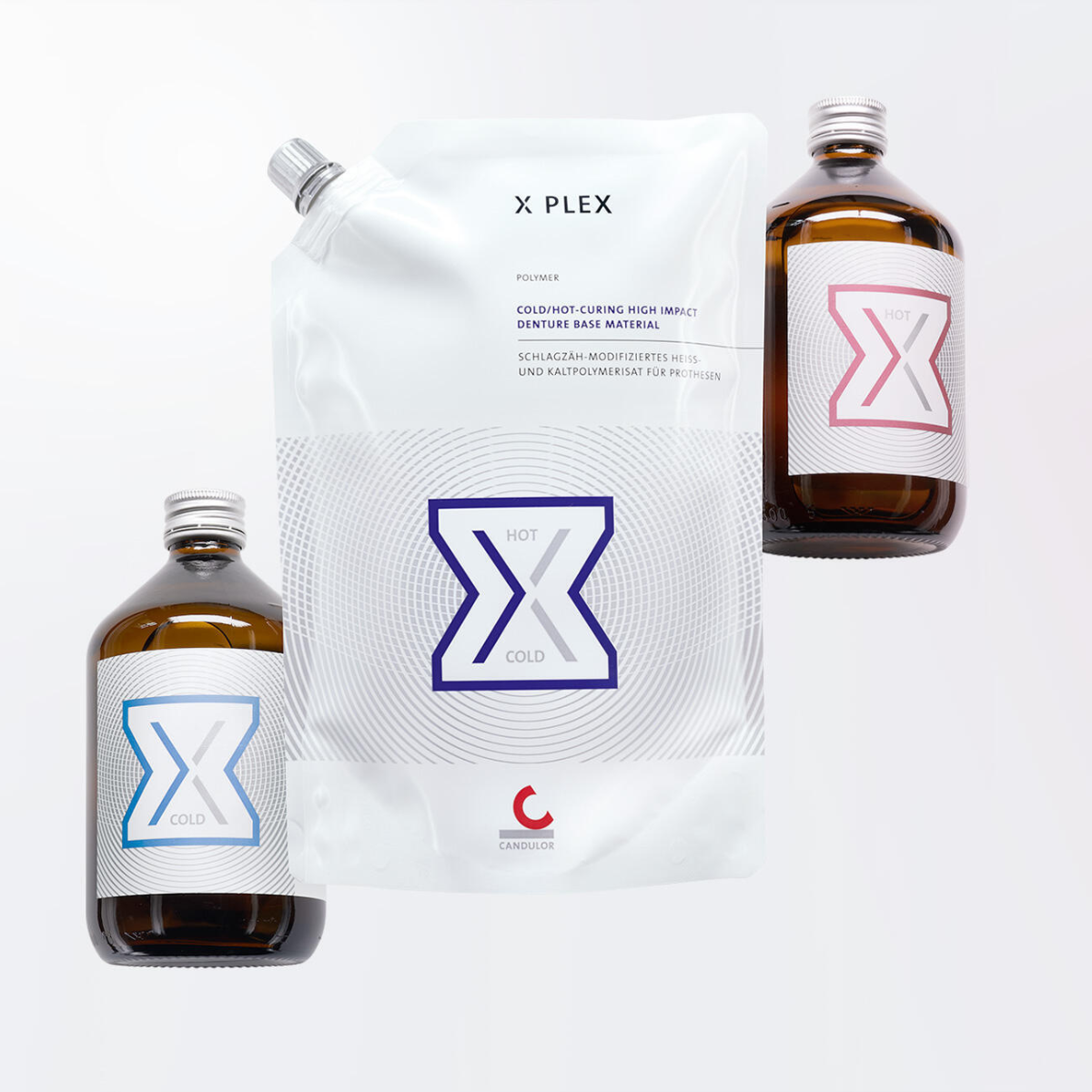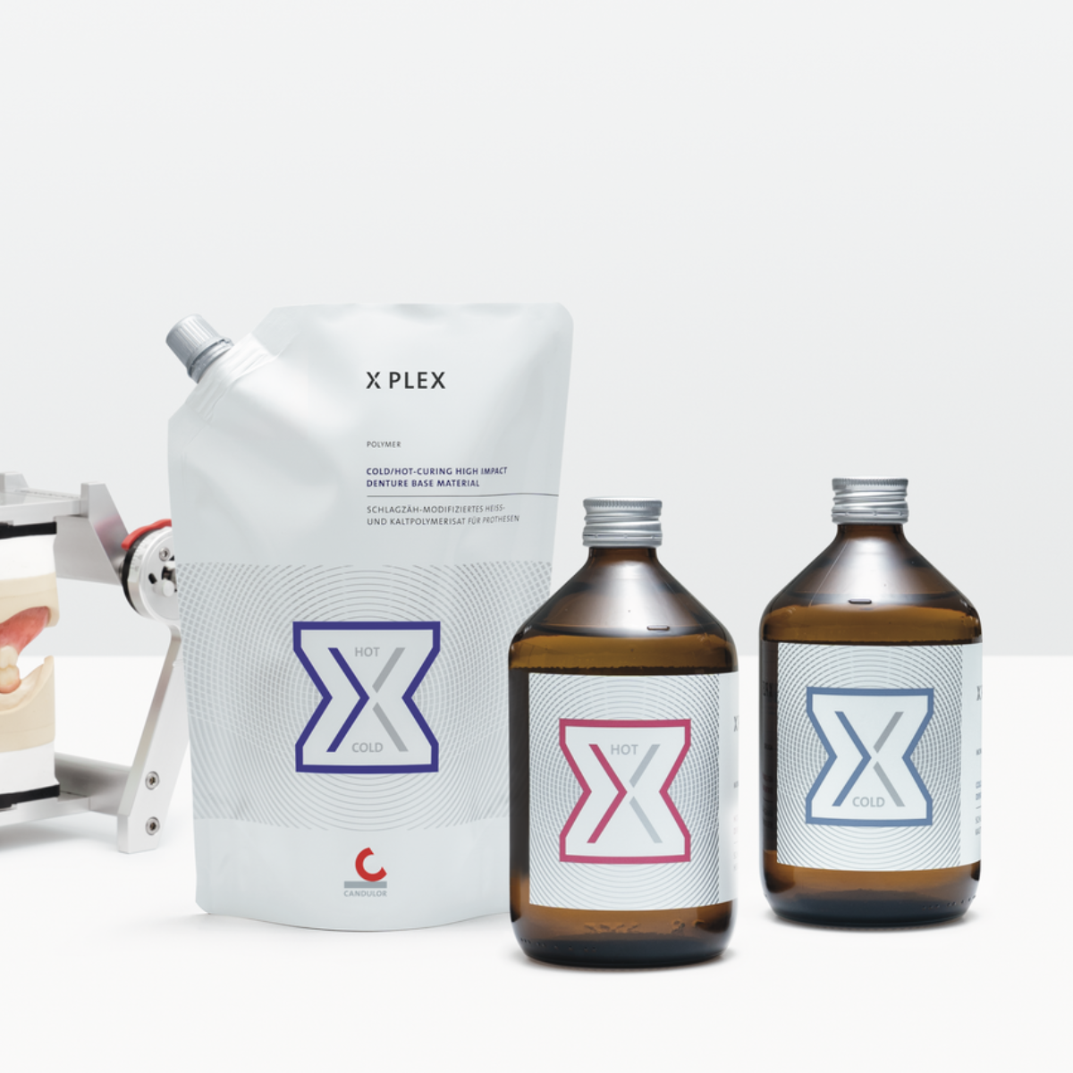 Der Polymaster eignet sich zur Kaltverarbeitung des dualen High-Impact Kunstoffs XPLEX. Zur individuellen Charakterisierung der Gingiva sind die intensiv eingefärbten XPLEX Polymere 53, 55 und 57 verfügbar.