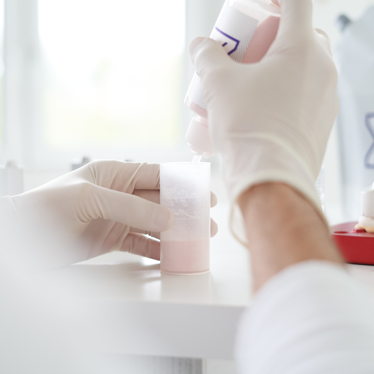 • Kaltverarbeitung Giesstechnik: Mischungsverhältnis für eine Prothese: 22 g Polymer : 16 ml Monomer